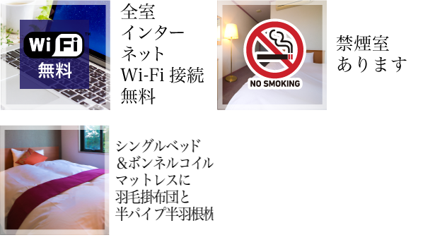 | お部屋の設備 | バス・トイレ付/Wi-Fi接続無料/全室禁煙 |