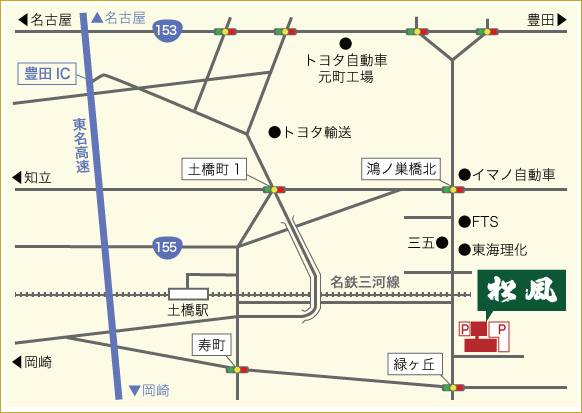 電車の場合・・・名鉄三河線「土橋駅」または愛知環状鉄道「三河豊田駅」より徒歩15分前後